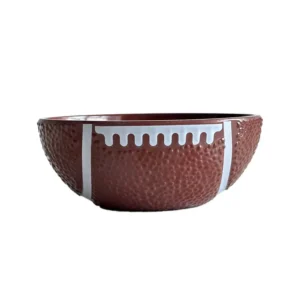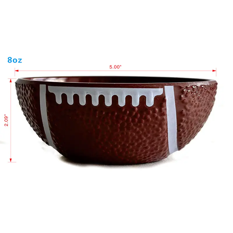 This bowl is shaped like a brown football and has a textured exterior. The outside also has white detailing ,and can hold 50ml liquor bottles. Dimensions: 2.09″ H x 5″ W x 8.5″ D. Material: Melamine. Color: Brown & White. Safety: Hand Wash Only; Do Not Microwave.