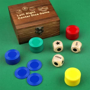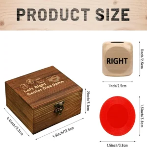 【BEAUTIFULLY MADE & STURDY】Giant left right center dice game prime are made of wood.Size of wooden box:4.9*4.4*2”(12.4*11.2*5.1cm).Each dice is finished to ensure it has rounded edges and is smooth.Size:1 inch. They are also beautifully stained in order to make sure that the wood is sealed. Dots and patterns are burned into the wood, making them long lasting.And the size of chips are 1.5 inch.