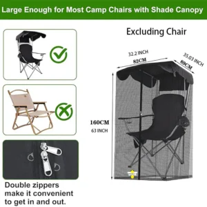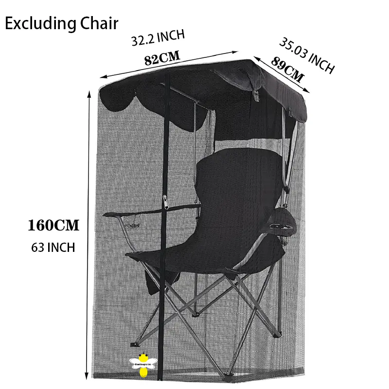 The size of the black mosquito mesh tent is 35.03*32.2*63inch(89*82*160cm).It is suitable for most 1-person canopy chairs and small patio swing, making it a great choice for outdoor activities such as fishing and camping.
