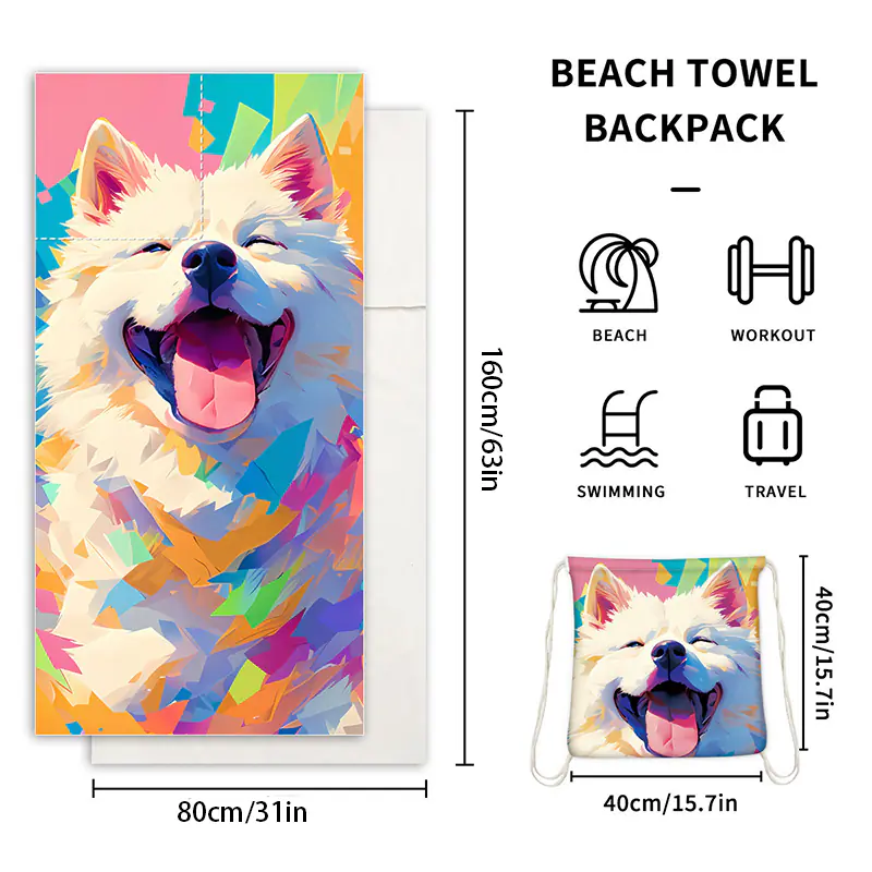 The size of this 2-in-1 towel backpack is around 31×63”(80x160cm).It is made from high-quality microfiber, this towel dries rapidly and keeps sand out, ensuring a fresh and comfortable experience wherever you are.It comes with an integrated storage bag that keeps all your essentials organized while on the go. Perfect for a beach day or your next adventure.Choose and enjoy it!